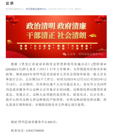 为切实把惠民政策送到群众身边,深入落实《黑龙江省就业补助资金管理和使用实施办法》(黑财规审〔2024〕11号)及大就发〔2025〕23号文件精神,让灵活就业人员社保补贴政策真正落地见效,保障每一位符合条件群众的合法权益,呼玛县就业服务中心以“公开、公平、公正”为原则,正式启动2025年度灵活就业人员社会保险补贴第一批人员名单公示工作,通过线上线下多渠道同步推送,让群众查询更便捷、知晓更及时。